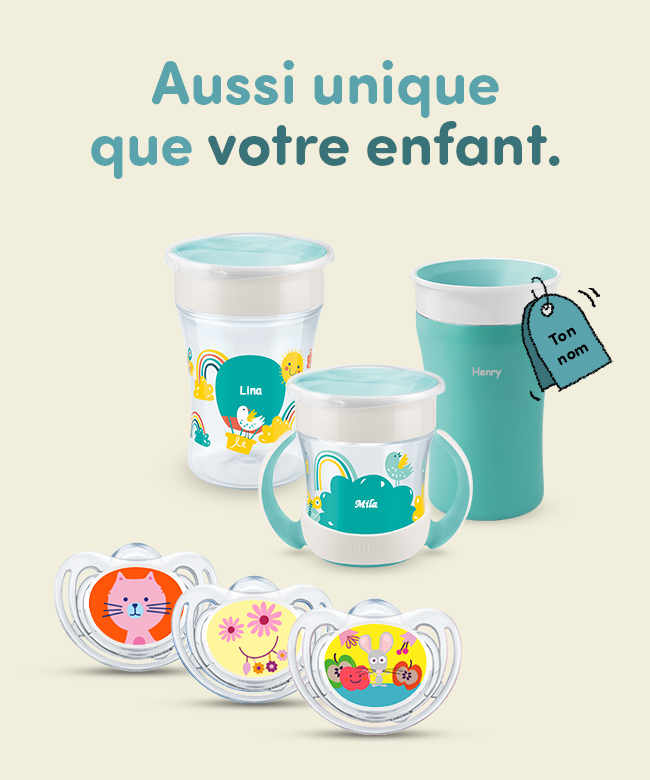 Chaque enfant est unique ! Avec nos produits, qui peuvent être personnalisés, vous avez de nombreuses possibilités pour exprimer cette singularité- de la gravure d’un nom sur la Magic Cup à la personnalisation complète de votre sucette. Il n'y a presque aucune limite à votre imagination !